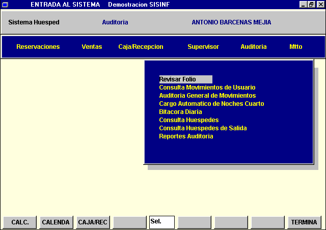 • Nombre del Usuario: Aquí se muestra el nombre del usuario que está trabajando en esta terminal y a la cual le será registrada toda actividad realizada mientras su clave esté activa. Para este ejemplo Antonio Barcenas Mejía es el usuario activo.